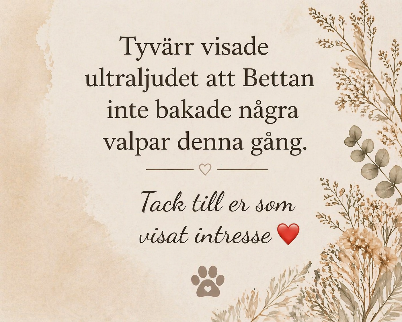 Tyvärr visade ultraljudet förra veckan att det inte fanns några valpar i Bettans mage. Vi får se om vi testar igen, iså fall blir det nog inte förrän nästa år - men vi får se som sagt.